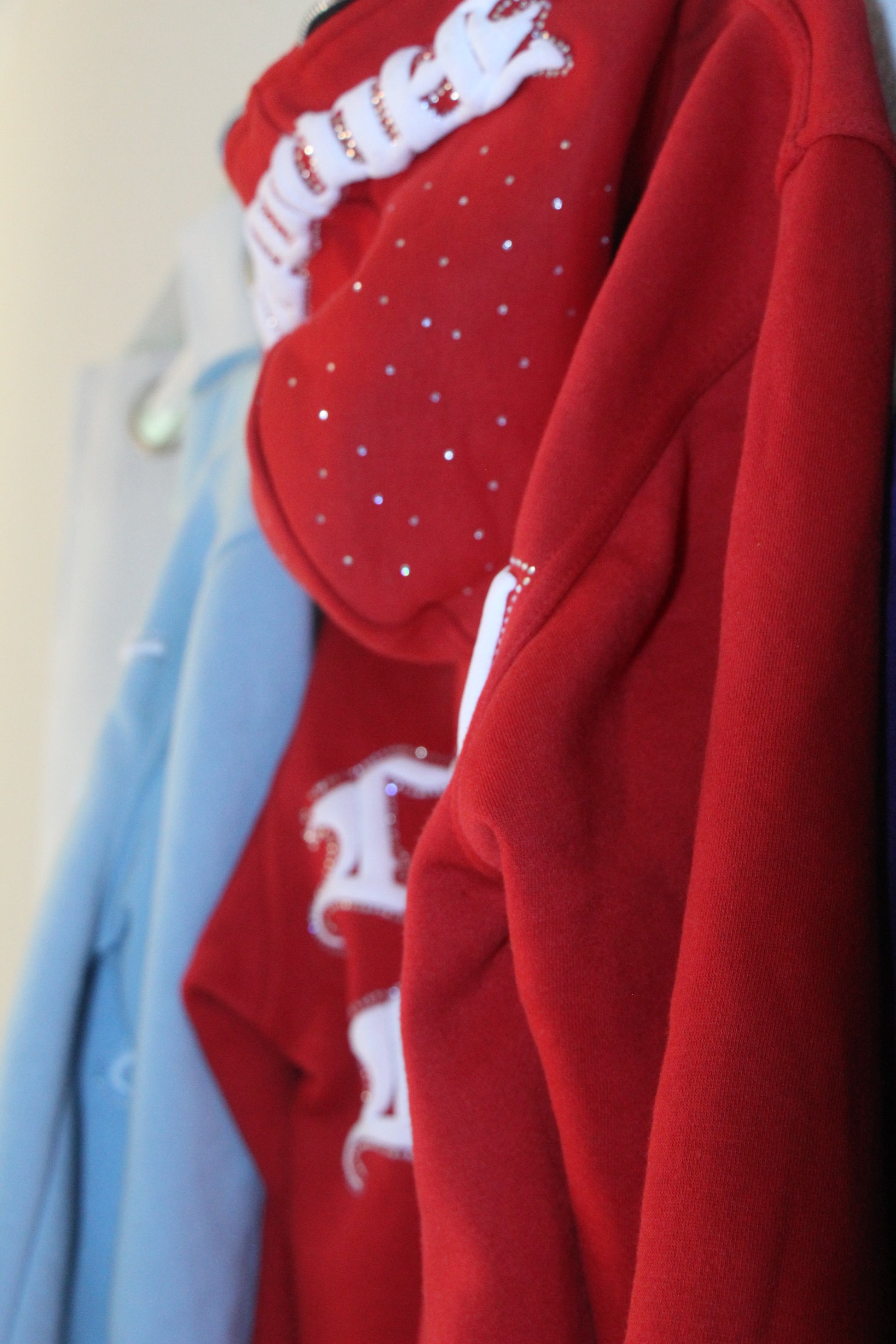 - Rhinestone covering the wording on hoodie